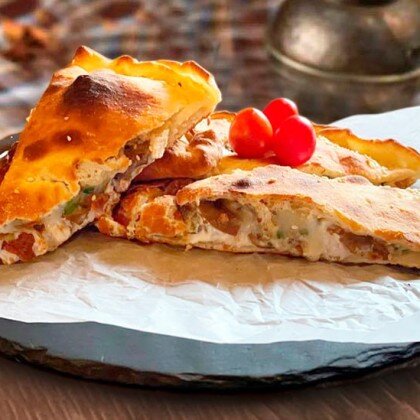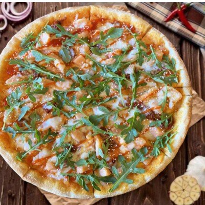 Новинка ! Мы разработали новое тесто для супер вкусных пицц! Пицца на традиционной лепешке . Сливочный соус,тигровые креветки , слабосоленая семга , вяленые помидоры, моцарелла , сливочный сыр , руккола , унаги соус , кунжут .