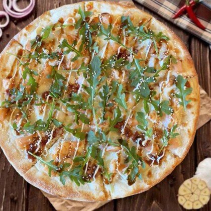 Острый соус , тигровые креветки , слабосоленая семга, вяленые помидоры , моцарелла. Чили соус , руккола , кунжут . Для любителей по острее можно дополнительно, добавить соус 🌶️