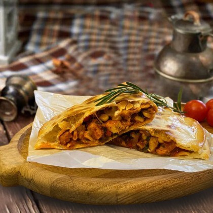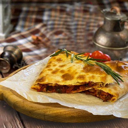 Блюдо мексиканской кухни . Хрустящая пшеничная лепешка ,свиной фарш, красный лук, красная фасоль , томатная паста , кинза , чеснок , сыр моцарелла ,в меру острый соус чили придает пикантную остринку .
