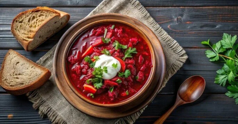 Классический борщ с говядиной , бородинскими гренками и сметаной