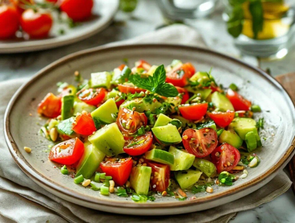 Салат из огурцов, помидоров, миксом салатов и авокадо
