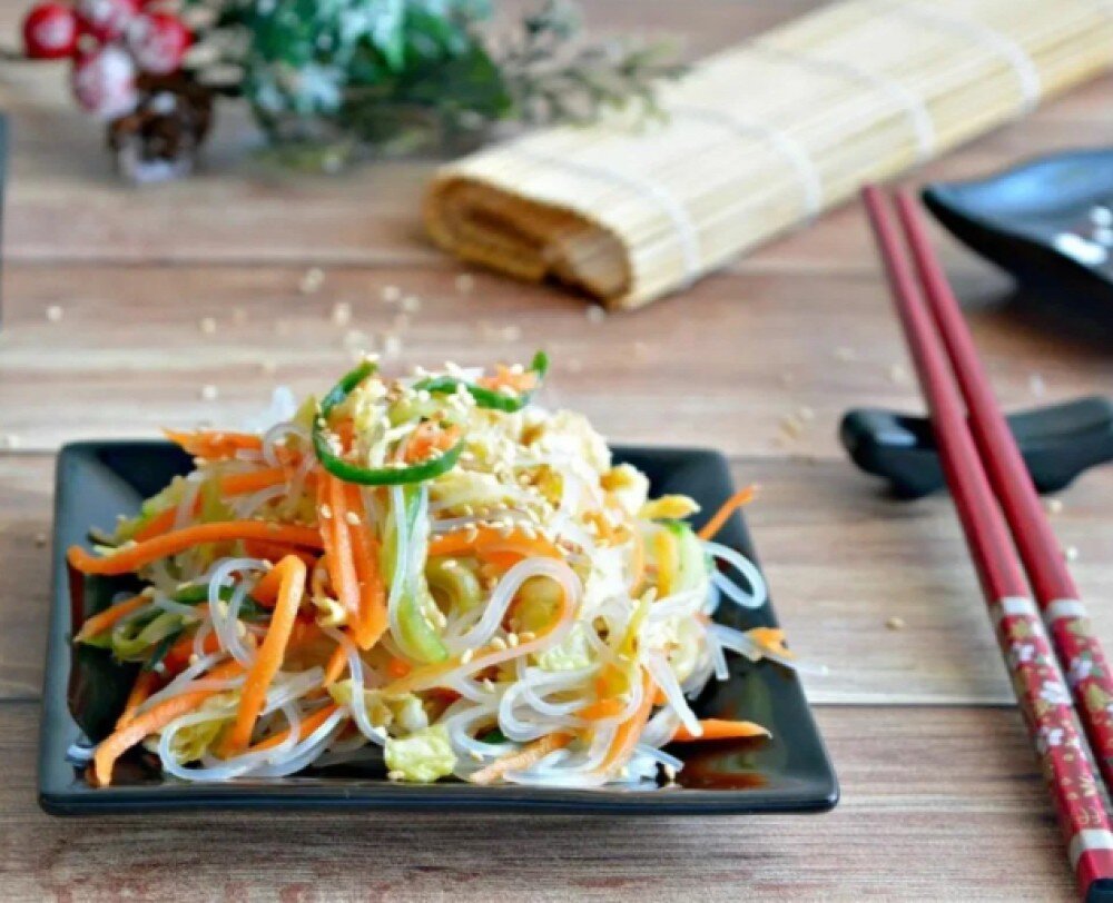 Сытный салат с фунчозой , пекинской капустой , лапшой из яичного омлета , огурцов и моркови с оригинальной заправкой на оливковом масле .