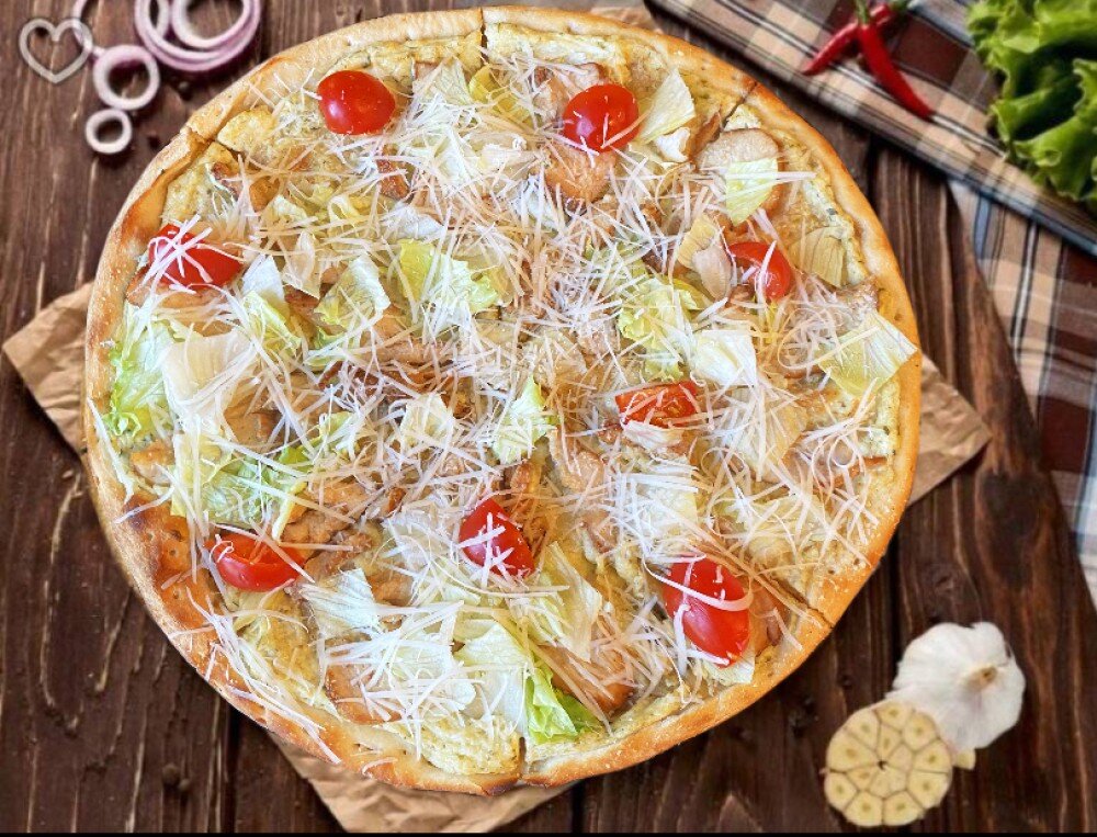 Пицца на основе классического рецепта : соус цезарь , курочка , салат айсберг , черри , пармезан .