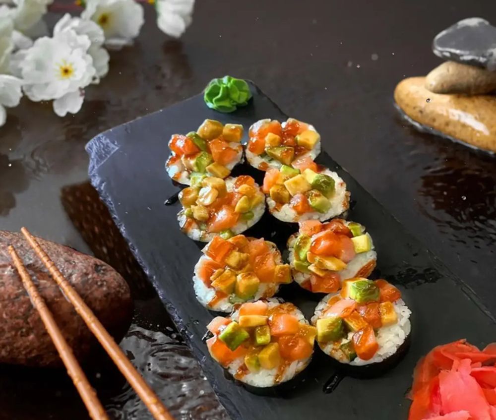 Семга слабосоленая , авокадо , сливочный сыр , огурец ,унаги соус.