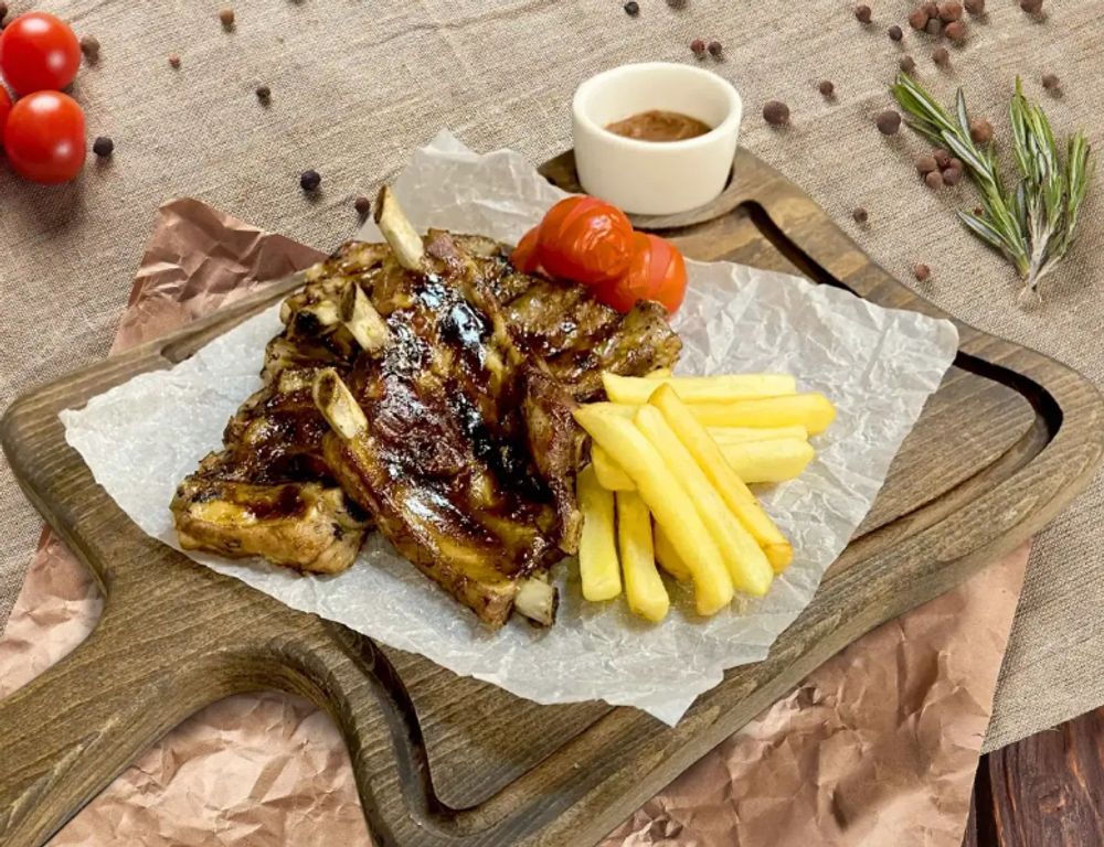 Сочный свиные запеченные ребра в соусе терияки . Подаются с картофелем фри , черри гриль и соусом сацебели.
