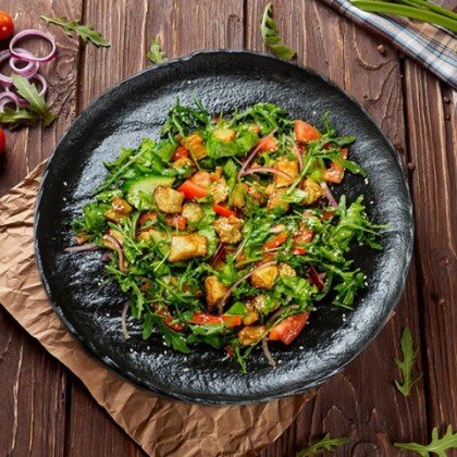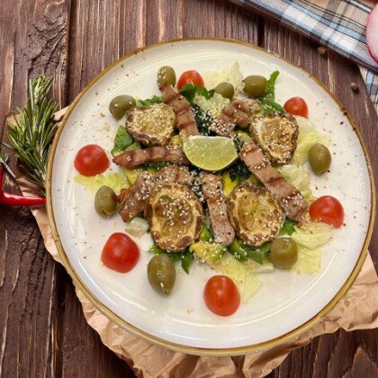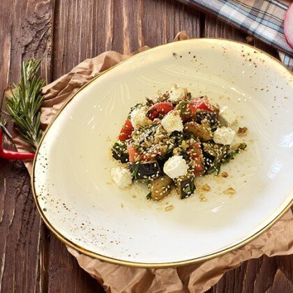 Грузинский салат с хрустящим баклажаном , сливочным сыром и грецким орехом
