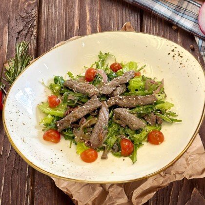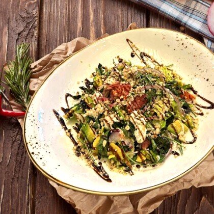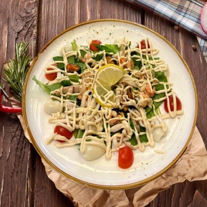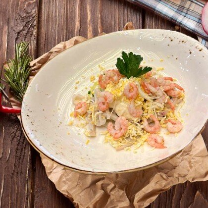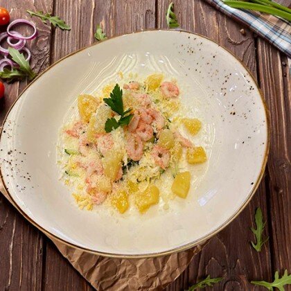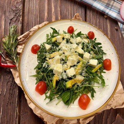 Изящные листья салата руккола с жареными шампиньонами, помидорами, обжаренными тигровыми креветками, кедровыми орешками, сыром пармезан, под лимонной заправкой с уксусом бальзамико