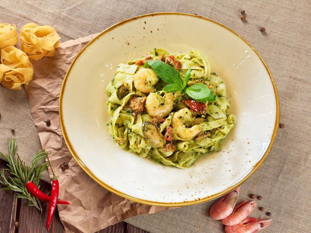 Фетучини с соусом песто, морепродуктами и вялеными помидорами