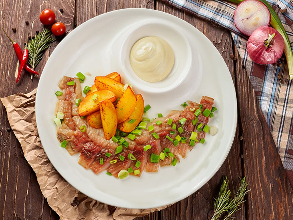 Филе сельди с золотистым картофелем, зеленым лучком и горчичным соусом