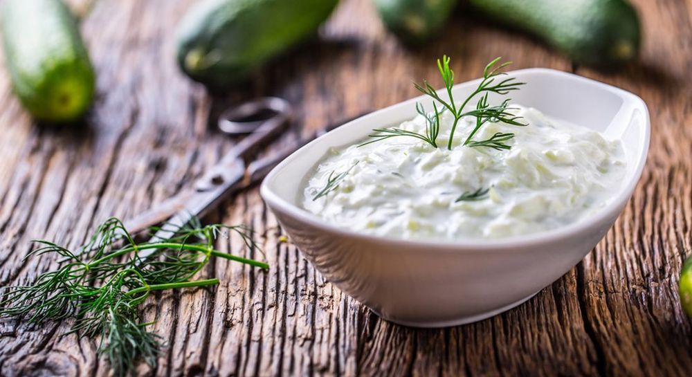 Греческий йогурт , свежий огурец , чеснок , масло оливковое .