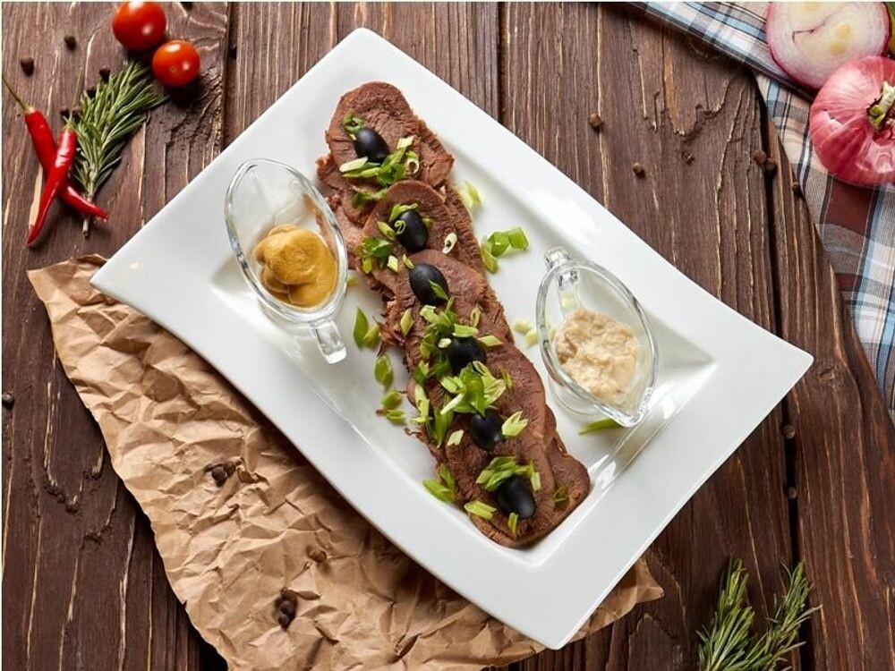 Отварной говяжий язык, хрен, горчица, маслины, зеленый лук