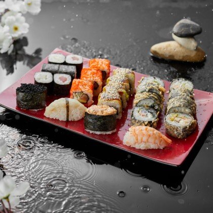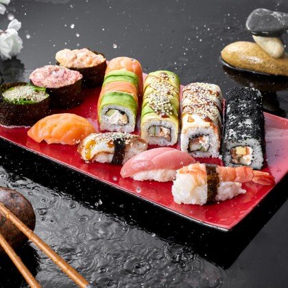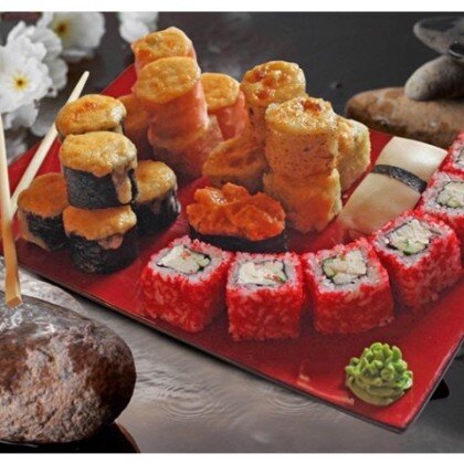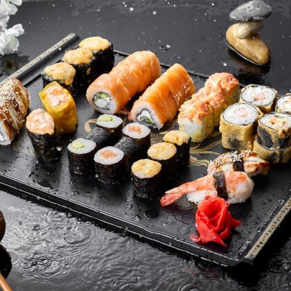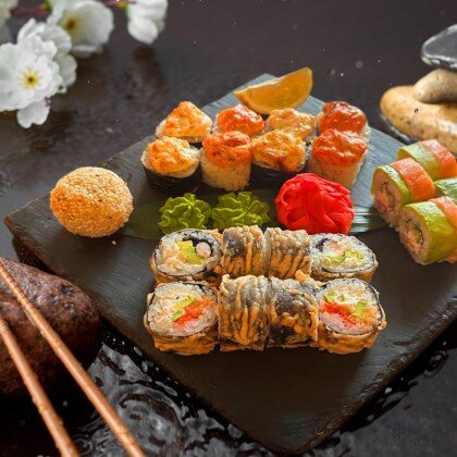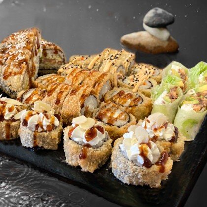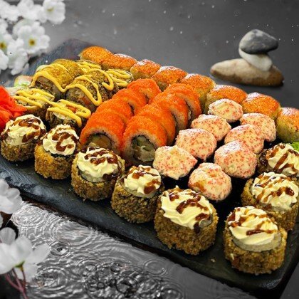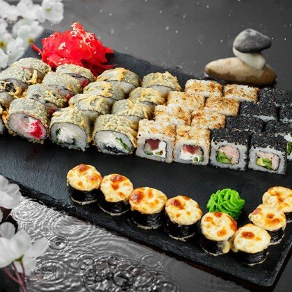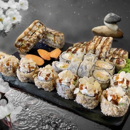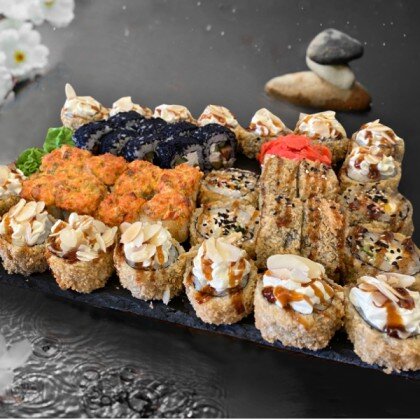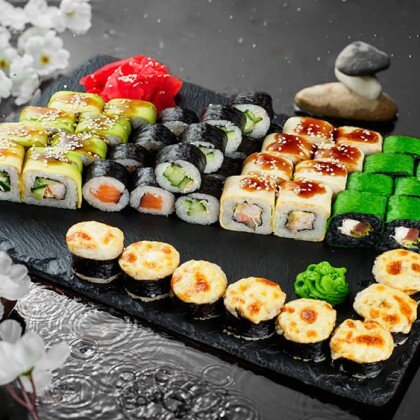 Холодные роллы с тигровой креветкой, авокадо и стружкой тунца, мидиями. Запеченный ролл с копченой курицей. Горячий ролл с тигровой креветкой, мидиями. Запеченный ролл острый спайси с тунцом