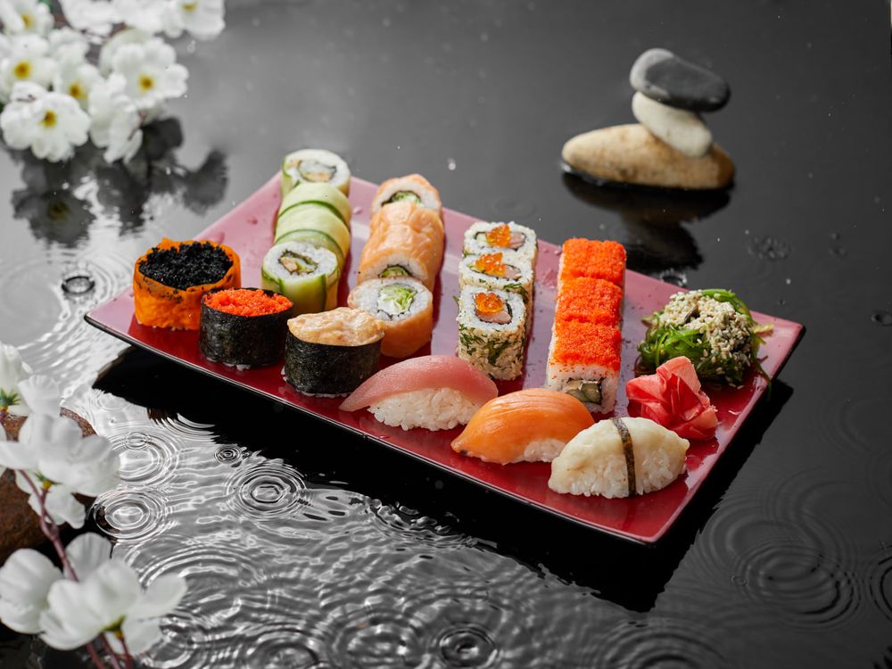 Холодные роллы со слабосолёной сёмгой, сливочным сыром, с копчёной сёмгой, ролл с морепродуктами, гунканы с масаго чёрной и оранжевой, суши с масляной рыбой, с тунцом, с сёмгой. Салат кайсо.