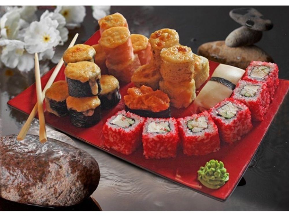 Запеченный ролл с курицей, сливочным сыром, хрустящим салатом айсберг и огурцом, заправленный пикантным соусом кимчи. Запеченные роллы с морепродуктами, сливочным сыром, хрустящим салатом айсберг, стружкой тунца и чипсами. Классический ролл в икре масаго, с огурцом, сливочным сыром и мясом краба. Острые гунканы с семгой и суши с кальмаром