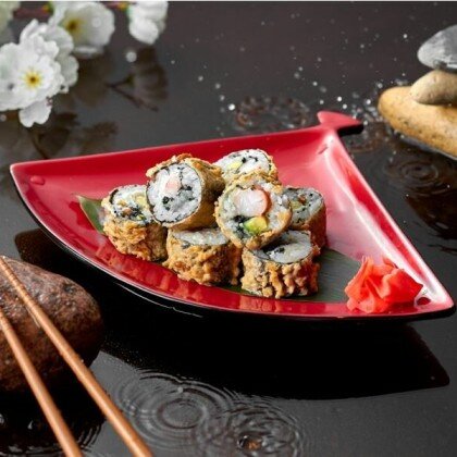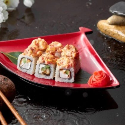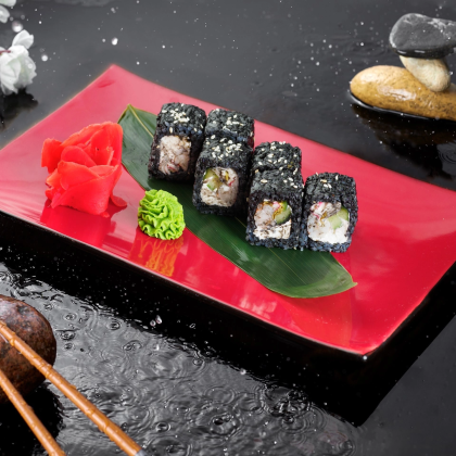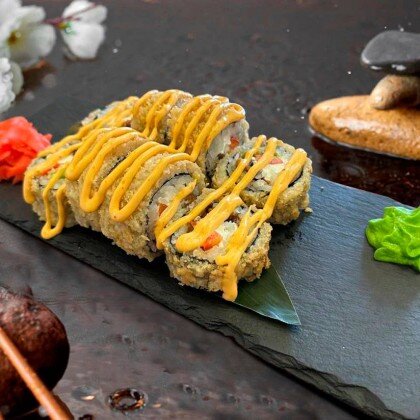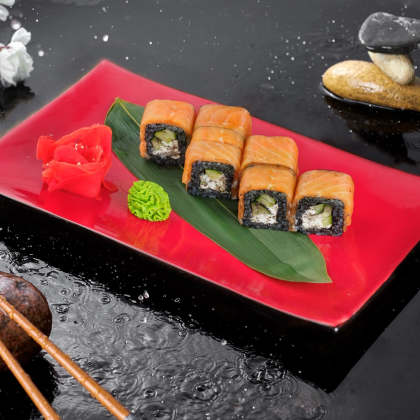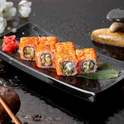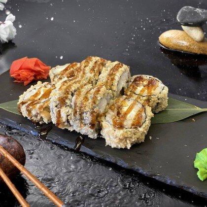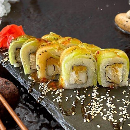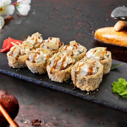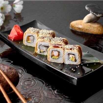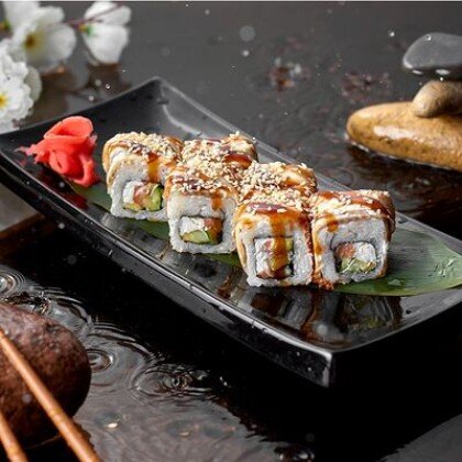 Угорь унаги голд, копченая сёмга, сливочный сыр, авокадо, огурец, кунжут белый, соус унаги