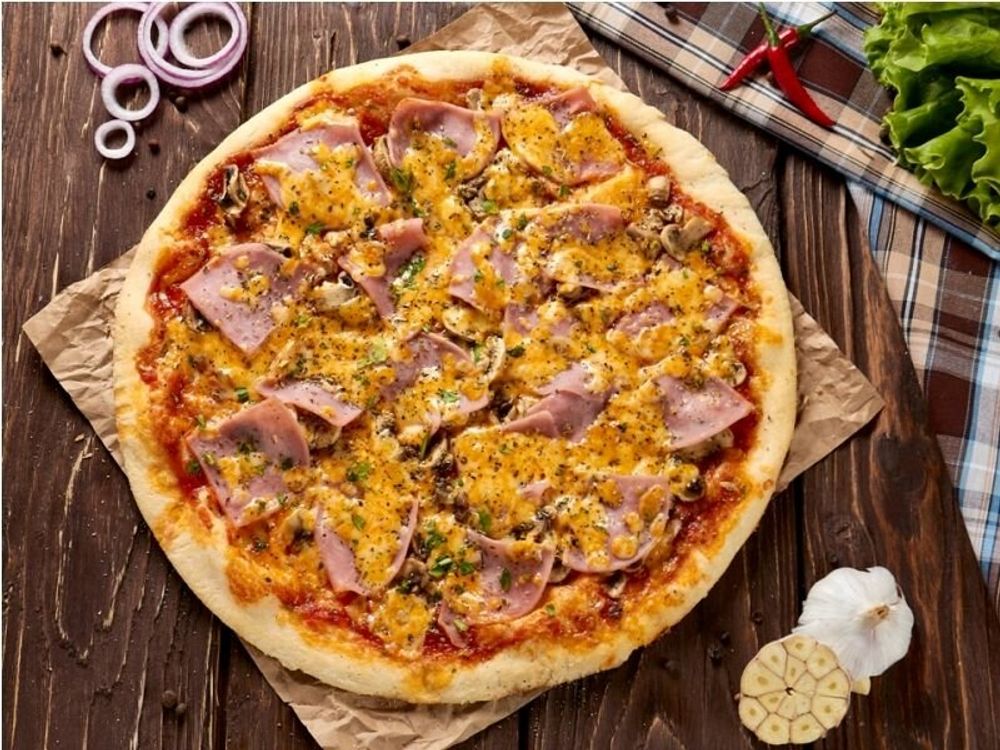 Популярная пицца с ветчиной, шампиньонами, мраморным сыром и орегано. (пицца 25 см на традиционной лепешке )