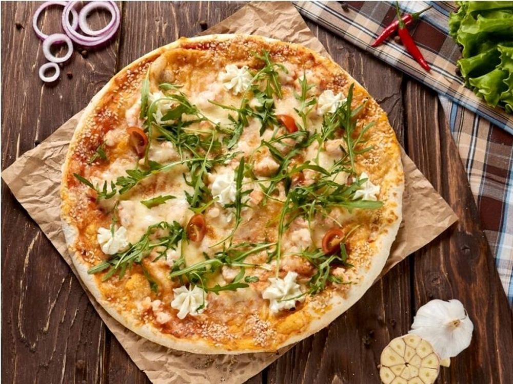 Пицца с мягким сыром, тигровыми креветками, пинк-соусом, помидорами черри, сыром моцарелла и руколой с кунжутом