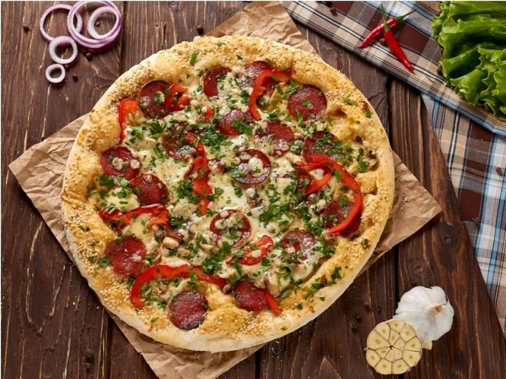 Пицца для любителей салями пепперони и сыра с голубой плесенью, с грибным соусом, сыром моцарелла и хрустящей корочкой с кунжутом