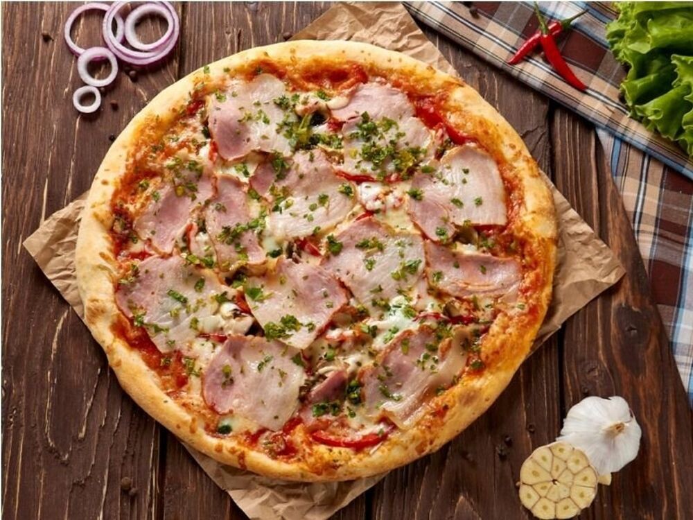Мужская пицца с сыром моцарелла, кусочками бекона, копченой курицы, болгарским перцем, красным луком, шпинатом, грибами и петрушкой