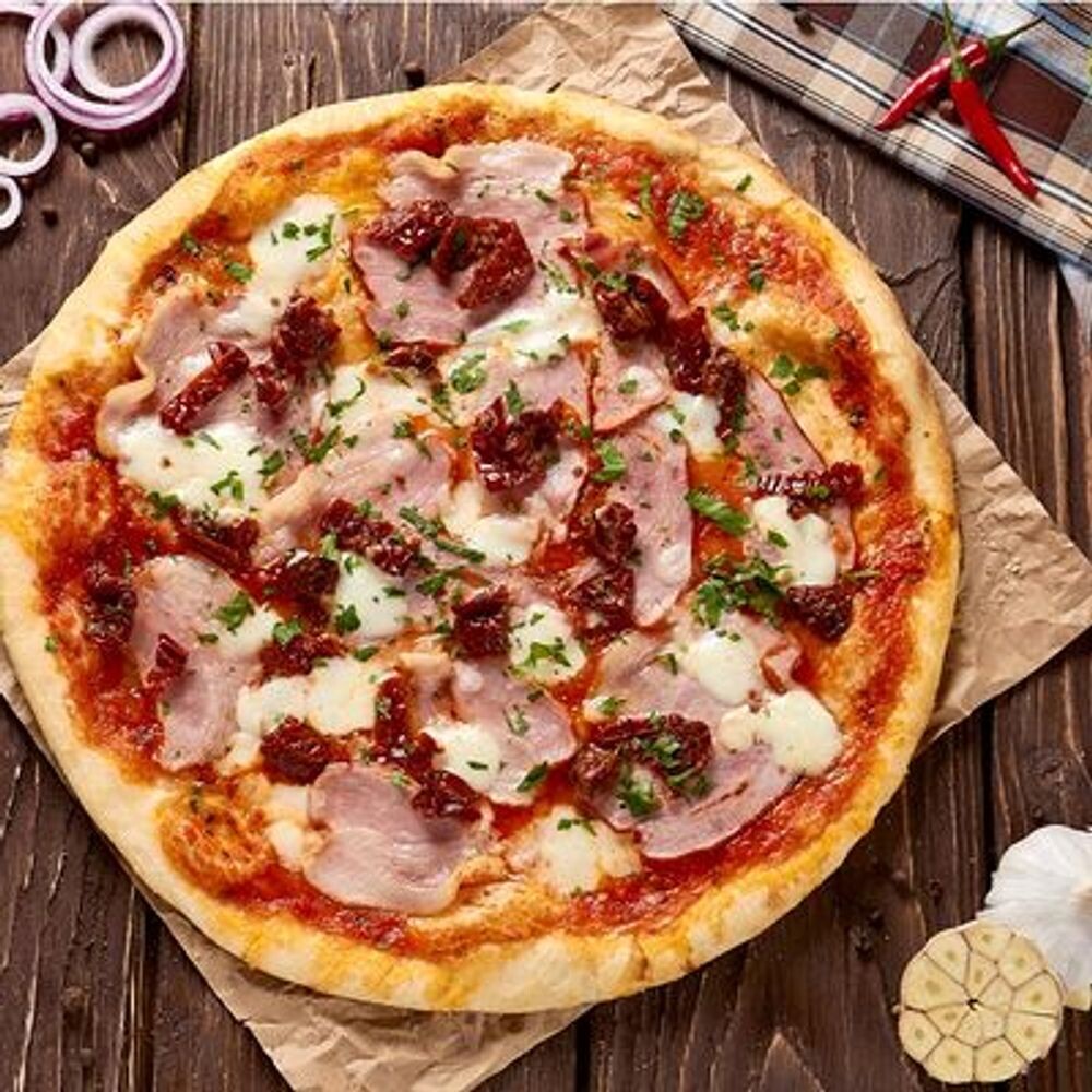 Ломтики копченого бекона с вялеными помидорами, пицца-соусом и молодой моцареллой, зелень. (пицца 25 см на традиционной лепешке )