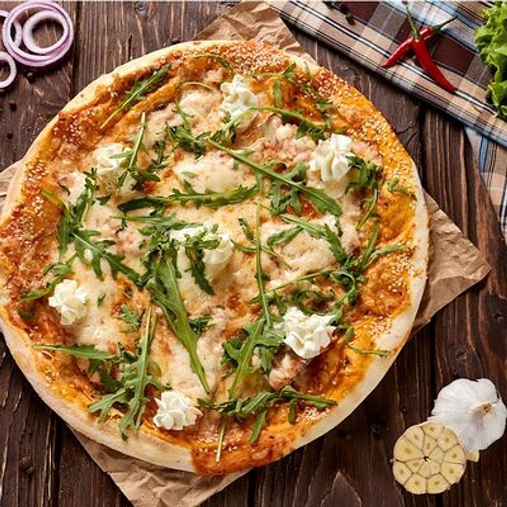 Пицца с нежным филе семги, мягким сыром, миксом сливочного и томатного соусов, моцареллой, руколой и хрустящей корочкой с кунжутом