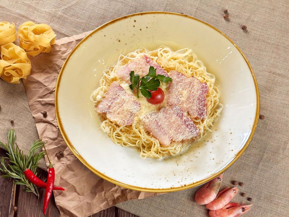 Паста с жареным беконом, сыром пармезан, яйцом и сливками