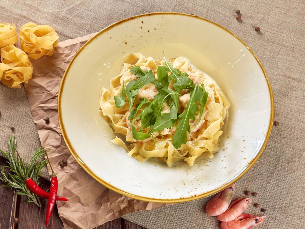 Паста под сливочным соусом с сыром пармезан и тигровыми креветками
