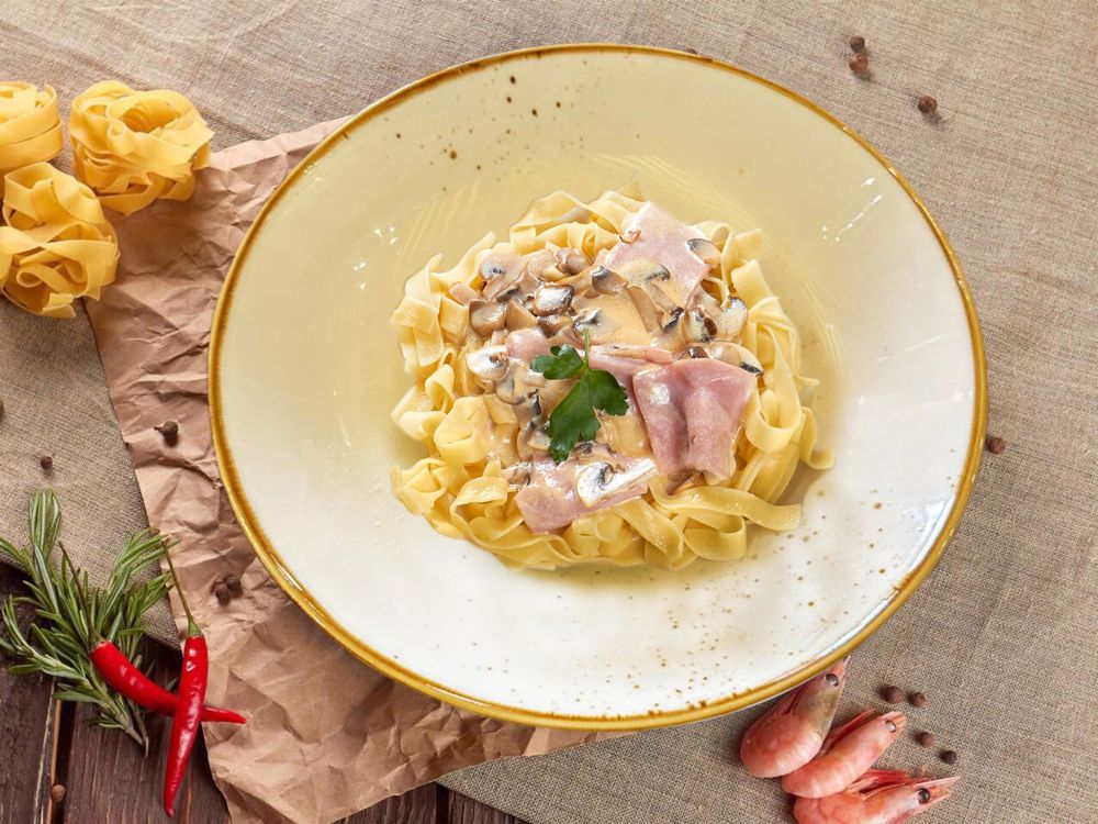 Паста с ветчиной, жареными грибами и сливочным соусом
