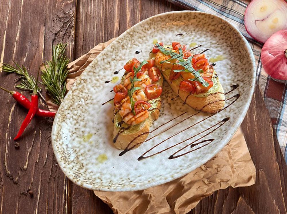 Сочетание пикантного гуакамоле с тигровыми креветками не оставит равнодушными ни одного гурмана, изюминку добавят помидорки черри, руккола, бальзамический соус.