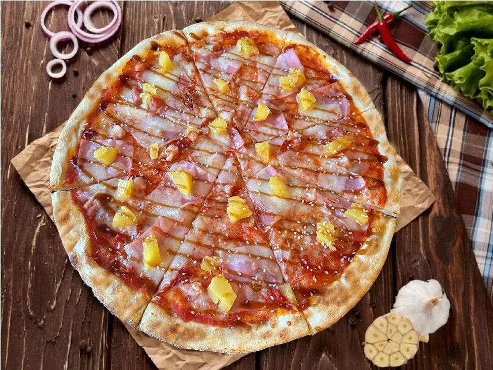 Сочная, хрустящая пицца с ананасом, копченой курицей, ветчиной, сыром моцарелла, унаги соусом и кунжутом. (пицца 25 см на традиционной лепешке )