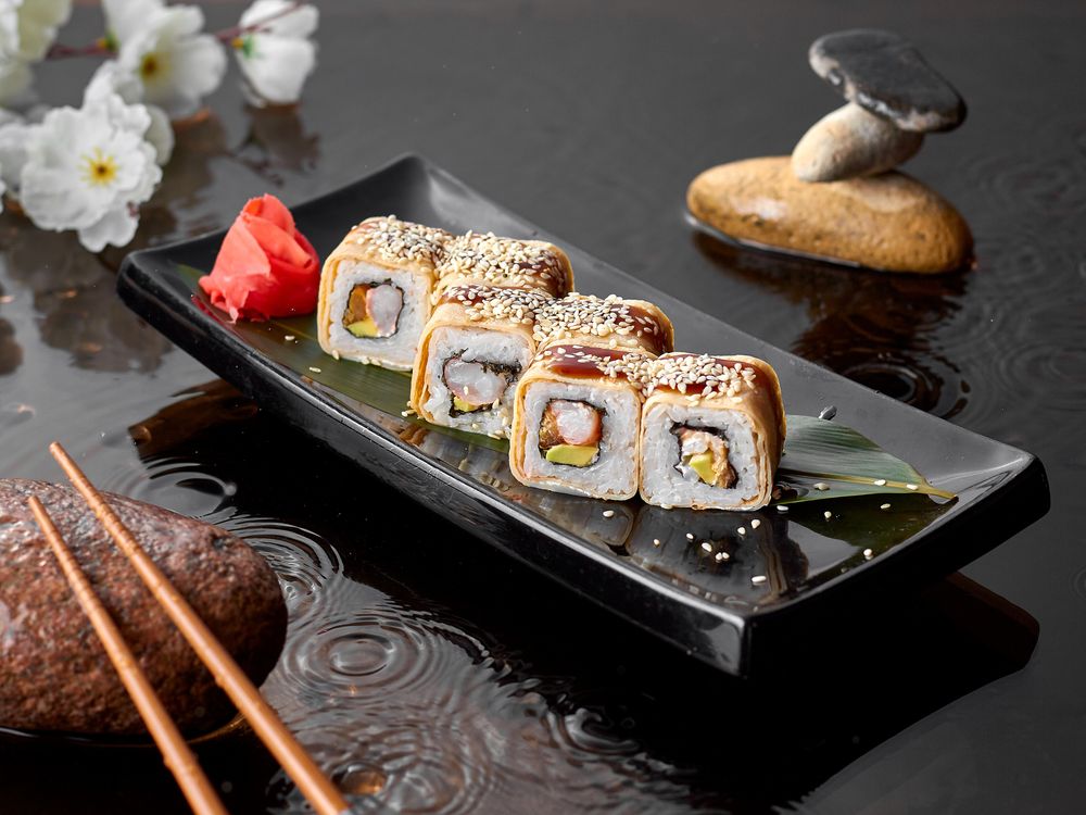 Лакедра, авокадо, тигровая креветка, спайс-соус, в японском омлете с кунжутом