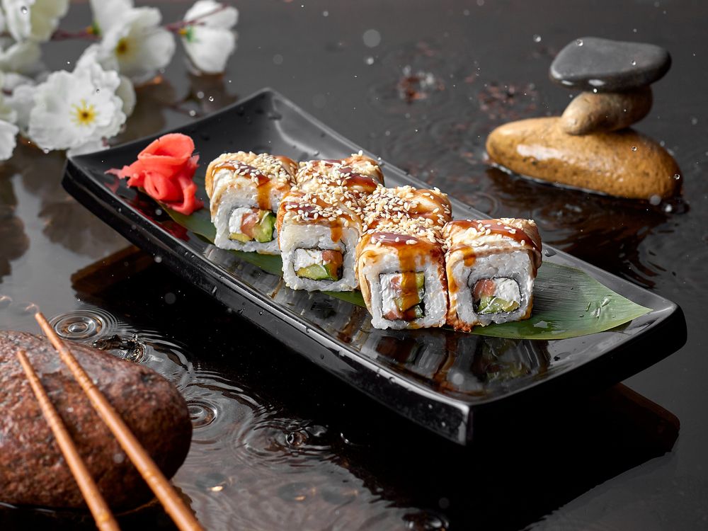 Семга свежая, угорь копченый, огурец, авокадо, сыр сливочный