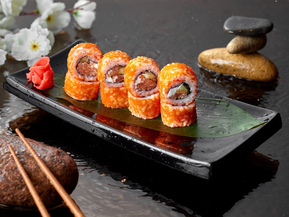 Копченая семга, сыр сливочный, огурец, икра масаго