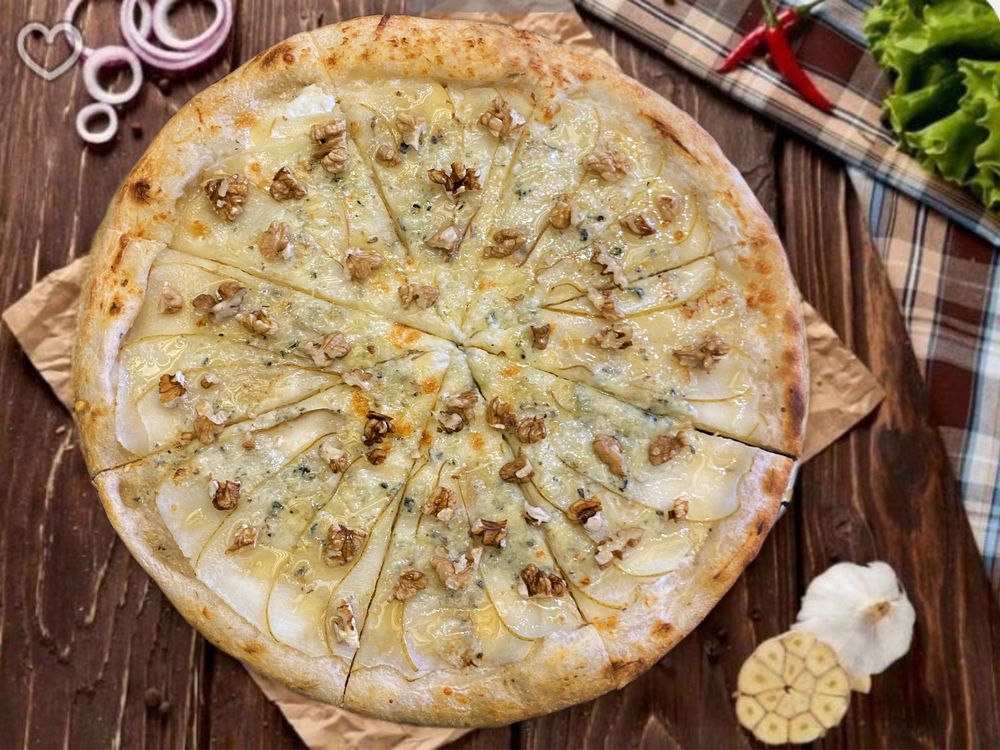Сливочный соус , моцарелла, груша политая медом в сочетании с сыром дор- блю , грецкий орех.