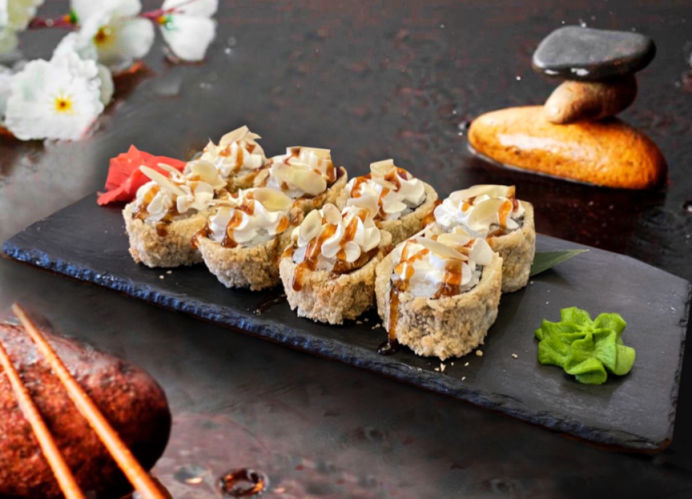 Сливочный сыр , огурец , кальмар фри , сухари панко , унаги соус , лепестки миндаля .