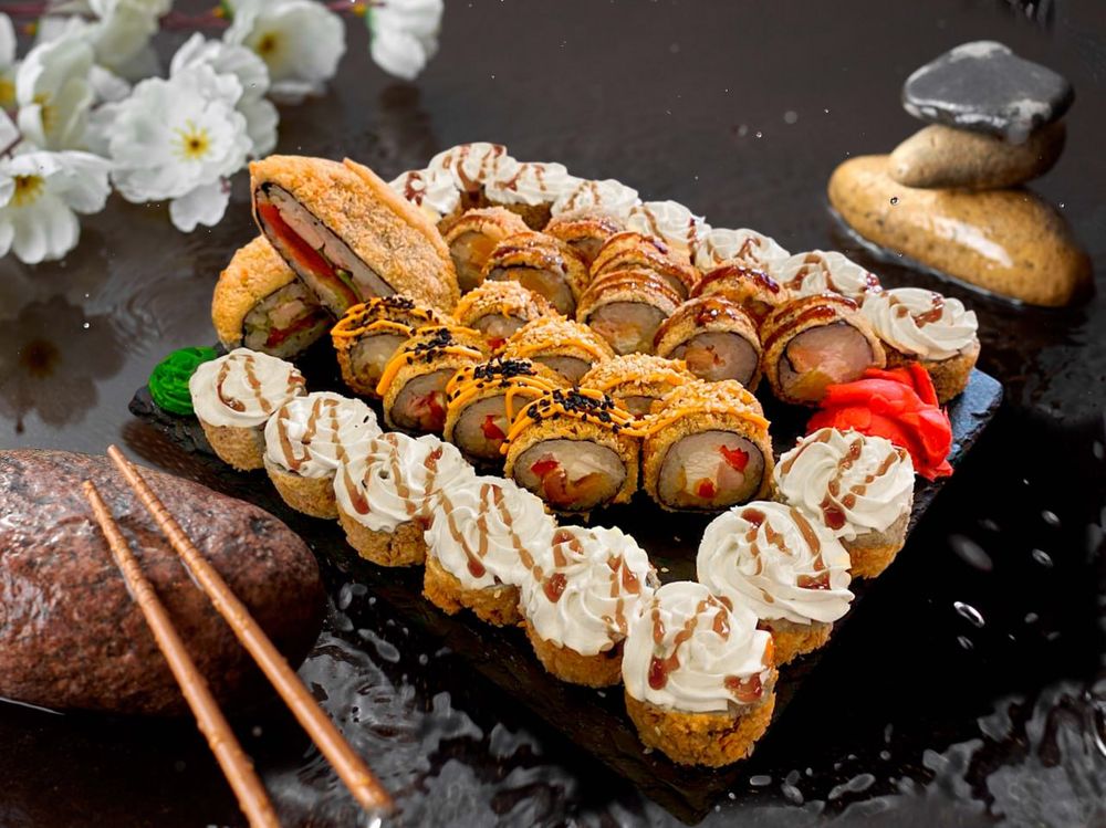 Дабл чиз с креветкой , суши бургер цезарь , дабл чиз с угрем , теплый ролл с семгой фри и персиком , чеддер темпура с курицей .