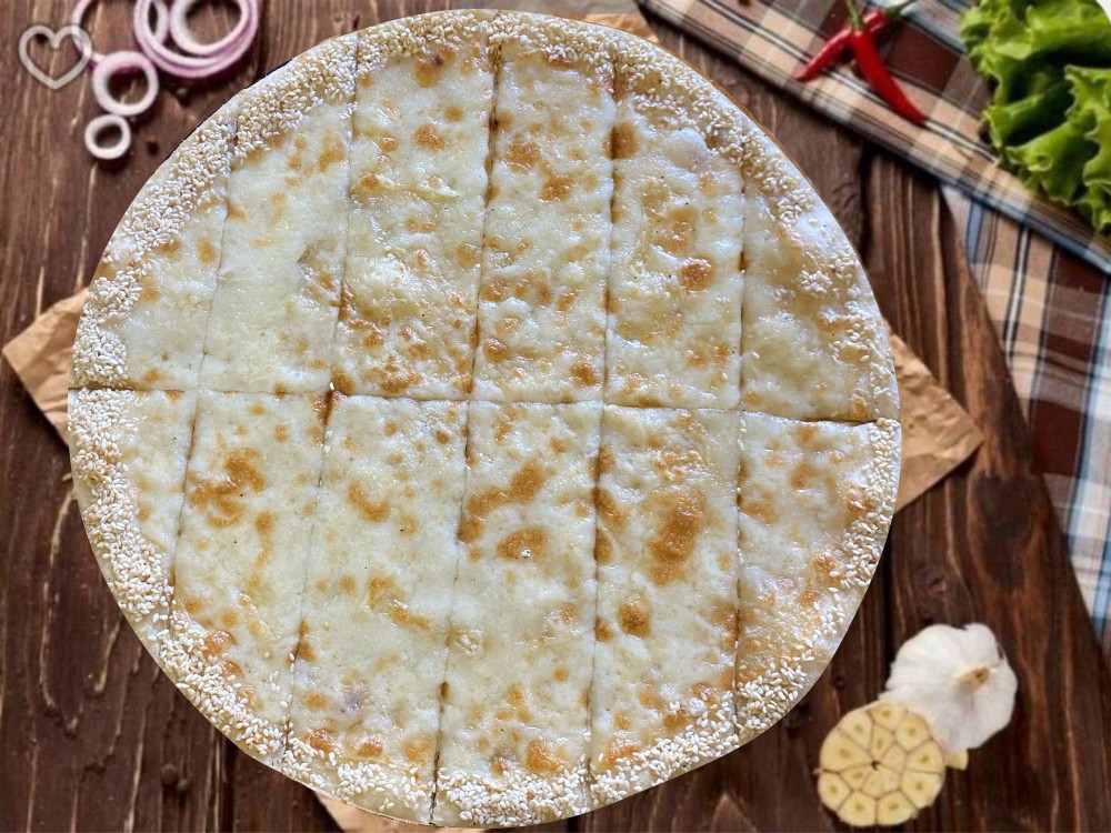 Пармезан , моцарелла, кунжут белый. (пицца 25 см на традиционной лепешке )