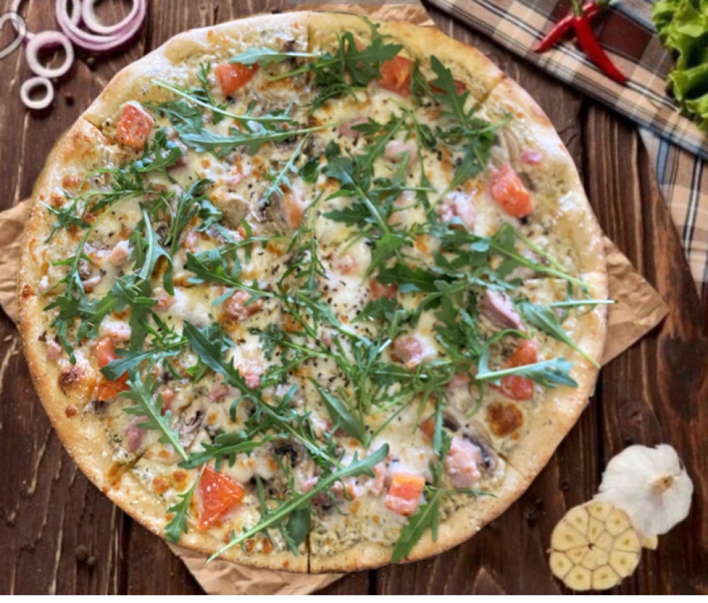 Соус цезарь , шампиньоны ,сливки , куриное филе , помидоры, пармезан , моцарелла, руккола. (пицца 25 см на традиционной лепешке )