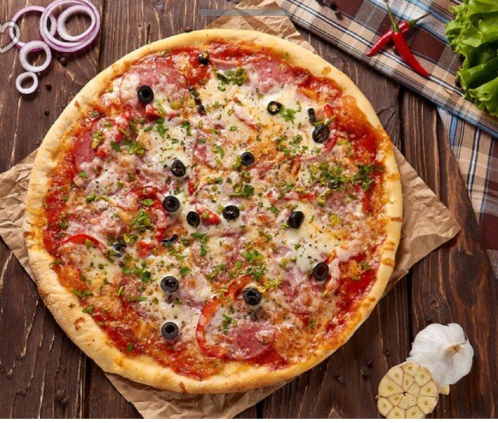 Ветчина , салями , красный перец , моцарелла, маслины , базилик .